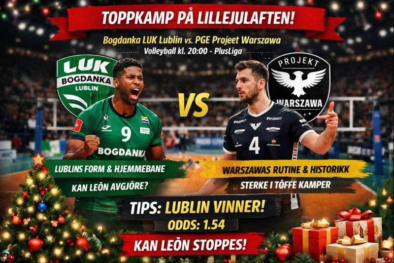 På lillejulaften får vi en toppkamp fra PlusLiga når Bogdanka LUK Lublin tar imot PGE Projekt Warszawa i kampen å kunne lede Plusliga når jula slåes inn. Med høyt tempo, sterke server og profiler på begge lag er alt lagt til rette for et underholdende volleyballoppgjør klokken 20:00. Både lagenes form og innbyrdes historikk peker mot en jevn og intens kamp. Og jeg forventer i dette Oppgjøret mellom Bogdanka LUK Lublin og PGE Projekt Warszawa kommer til å bli både tett og spennende.