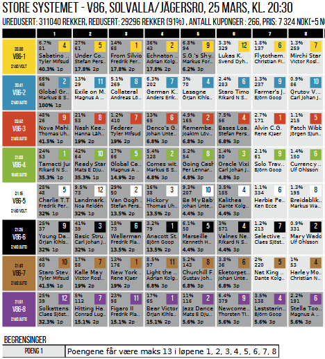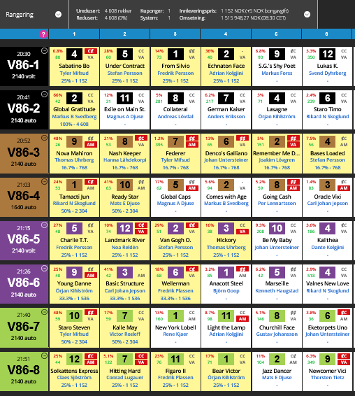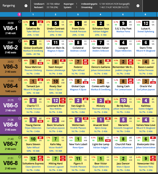 10 Staro Steven Staro Steven er en spennende hest som startet karrieren først i fjor som fireåring, og har levert sterkt med sju pallplasser på åtte starter, inkludert fire seire. I år har han vært ute i tøffere selskap og vant en STL-finale fra ledelsen på solid vis, før han sist kom for langt bak og aldri helt fikk tak i løpet, men likevel gjorde en godkjent innsats som femte. Nå står han bedre til etter en liten pause, treningen meldes å være svært bra, og for første gang skal han gå barfot rundt – en interessant endring. Med litt flyt fra bakspor har han gode muligheter til å runde dette feltet.