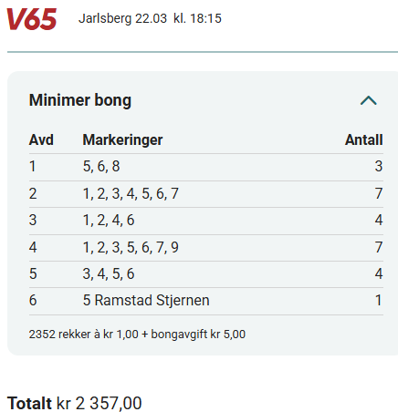 Motstanden ser klart enklere ut denne gangen. Dette fremstår som en solid vinnersjanse. Blir min banker for kvelden.