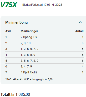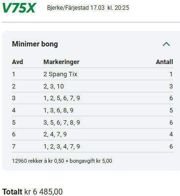V75 kjøres denne gangen på Bjerke og Färjestad, og omgangen byr på flere spennende oppgjør. Vi går offensivt ut i vår analyse med Spang Tix som banker i innledningen, mens Fjell Fjollå kan bli et nytt nøkkelpunkt senere i omgangen. Ellers venter flere åpne løp hvor løpsopplegg og posisjoner kan bli avgjørende.