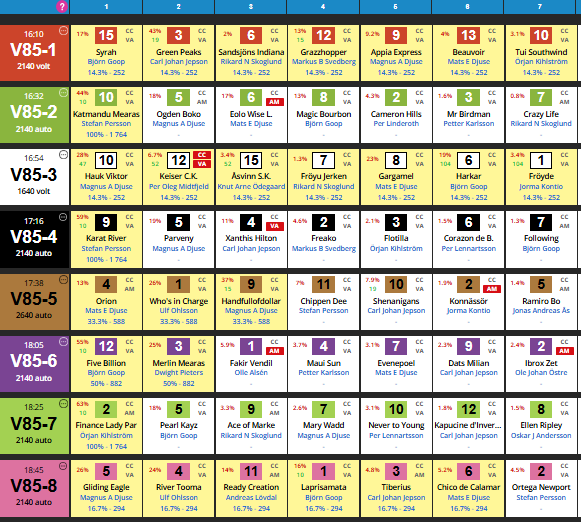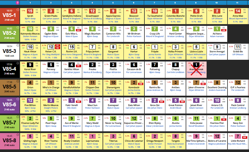 15 Syrah var god da hun tapte for Okaleia Boko på Färjestad 29/9, men har rotet seg bort ved et par anledninger siden. Sist var hun tilbake etter pause og leverte godkjent etter galopp i starten. Går hun feilfritt, har hun kapasitet til å runde det meste av feltet – kanskje alle. Får et frekt vinnertips i en åpen avdeling. 3 Green Peaks har avsluttet sterkt til to strake seirer. Hun er rask fra start, kan få en fin posisjon og det er ikke umulig at hun også sitter tidlig i tet. 6. Sandsjöns Indiana kan være løpets superskrell. Kan få seg en veldig fin start her, og få en fin reise. Stallen er faktisk litt optimister. Markert på kun 2 % !! torsdag kveld.